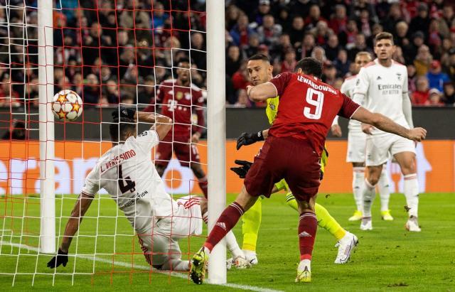 欧冠E组第4轮的一场比赛中,拜仁在主场5比2完胜本菲卡,莱万3球1助攻,还罚丢一粒点球。四战全胜的拜仁昂首出线!