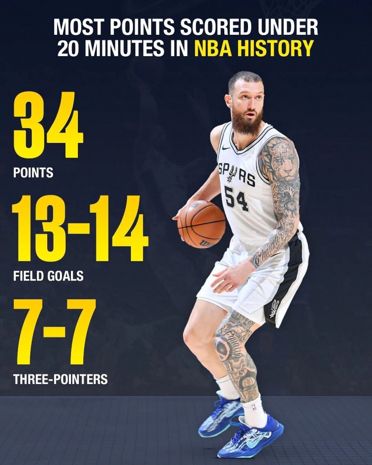 2025年3月19日,马刺主场迎战尼克斯,马穆替补登场短短19分钟,14投13中,其中三分球7投全中,拿下34分9篮板,帮助球队赢下胜利。他也创造了NBA的历史:成为史上第一位在上场不到20分钟内拿下34分的球员。