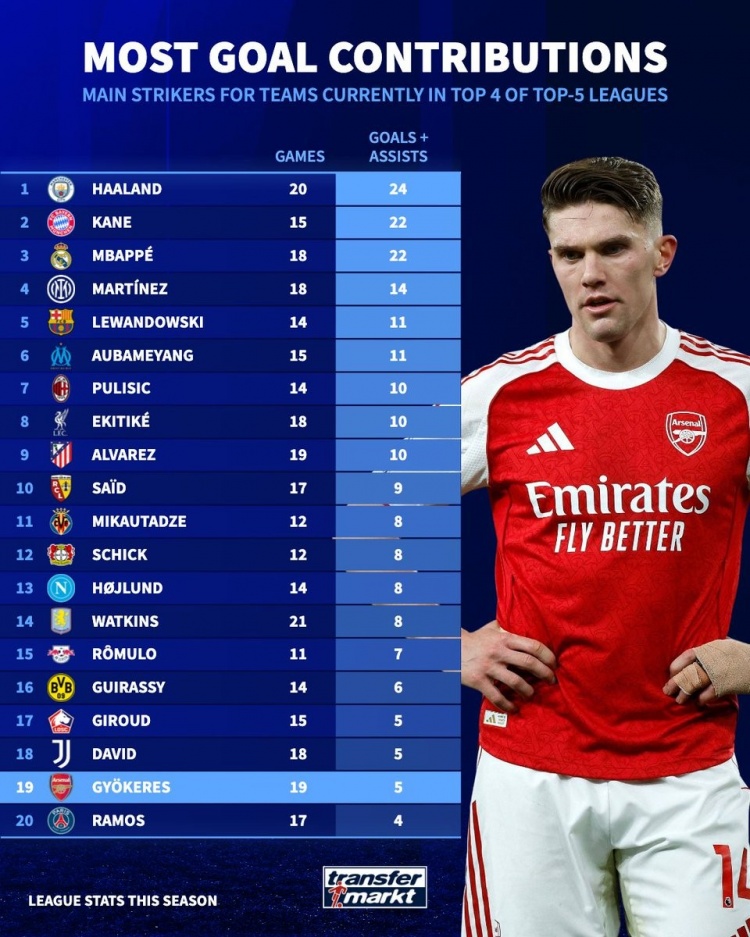 开云在线开户平台-各联赛前四球队主力中锋参与进球榜:哈、凯、姆前三 约克雷斯倒二