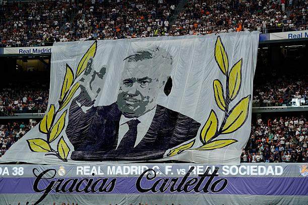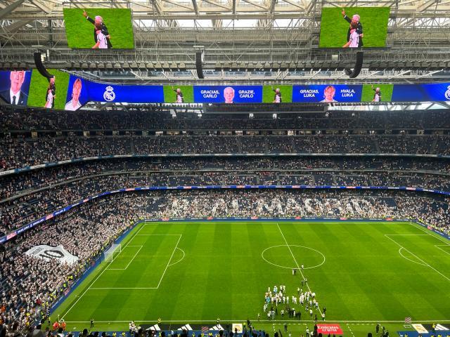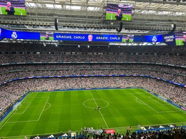 当皇马与皇家社会的比赛终场哨声响起,伯纳乌现场没有一人离开,所有人都深知接下来才是这一天伯纳乌的“正片”。中场休息的时候,伯纳乌现场广播就不断提醒球迷:“今天比赛结束后会有致敬安切洛蒂和莫德里奇的仪式。”